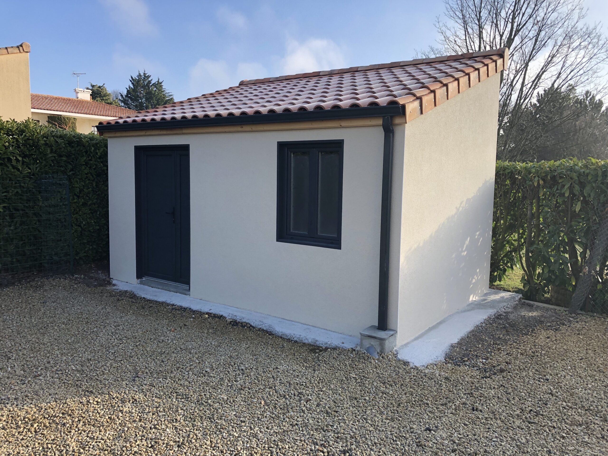 Abri de jardin en béton, couverture tuiles, porte et fenêtre en PVC