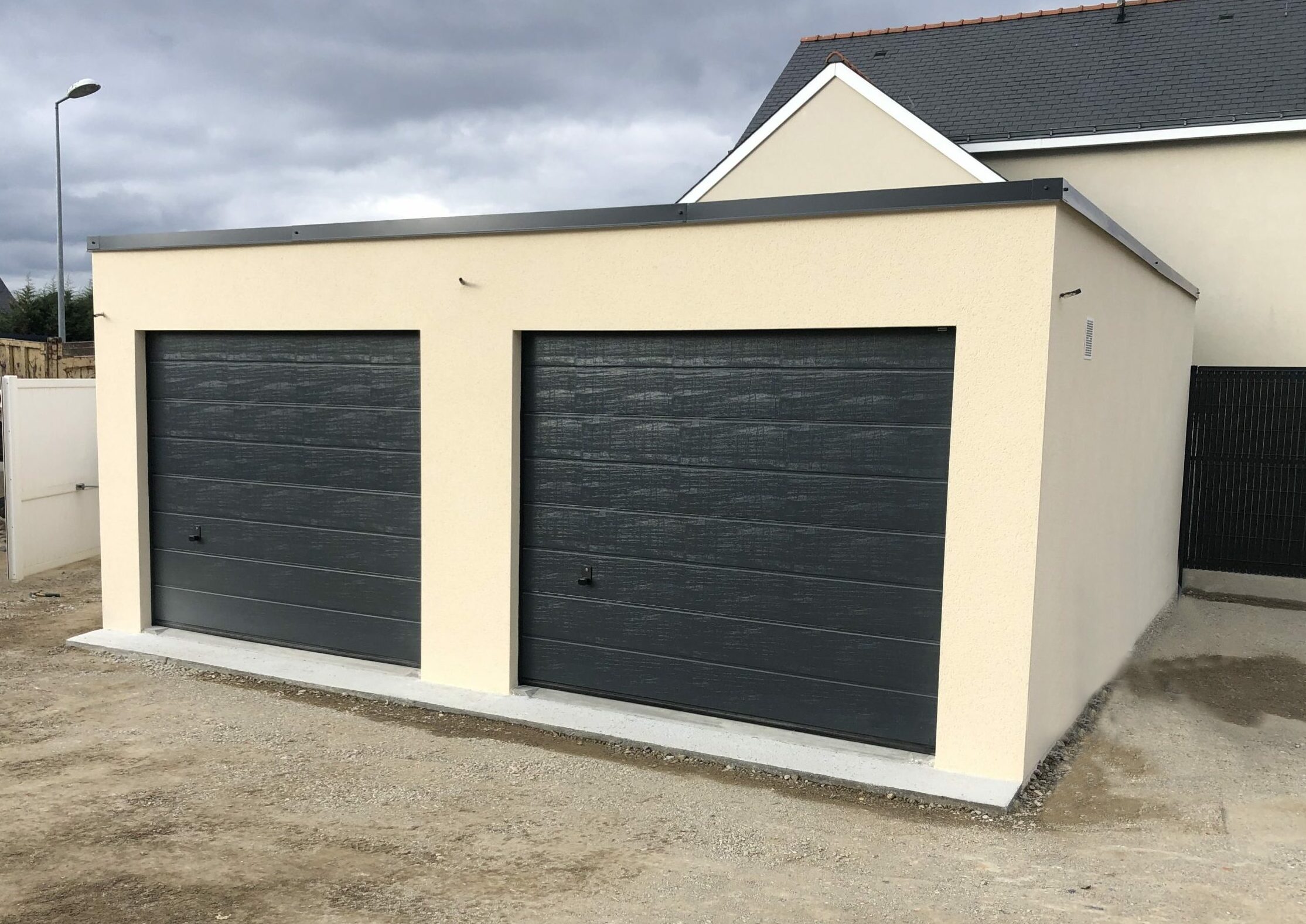 Double garage en béton, toit aspect terrasse